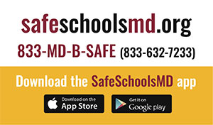 Students, family members, parents, teachers, administrators, and other community members can anonymously report information to Safe Schools Maryland via a mobile app available for download through the Apple App Store or Google Play, online at http://www.SafeSchoolsMD.org, or by calling 1-833-MD-B-SAFE (1-833-632-7233). Trained technicians will respond to reports 24 hours a day, seven days a week, 365 days a year.