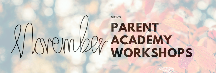Here are the November workshops we think will interest Lake Seneca families most. Unless otherwise indicated, workshops are suitable for parents and guardians of students in Kindergarten through Grade 5. For the full list of scheduled workshops, visit the MCPS Parent Academy online. Descriptions below provided by MCPS.